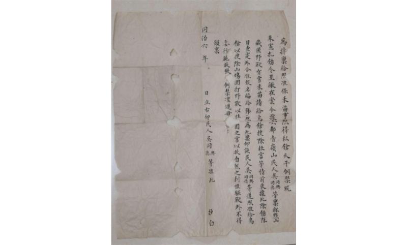 黄山市档案馆收藏的一份清同治六年(1867)的官府批文,记载了六都青岭山(今黟县青岭山)村民吴同兴、吴同德等人,因“黟山藏匿野兽,有害禾苗”,获准使用鸟枪“搜除山场,围打野兽”的案例。文书明确要求“惟驱兽外,不得妄行施放”,违者严惩,生动体现了清代对民间武器管理上“严格管控”与“因事制宜”并行的治理逻辑。