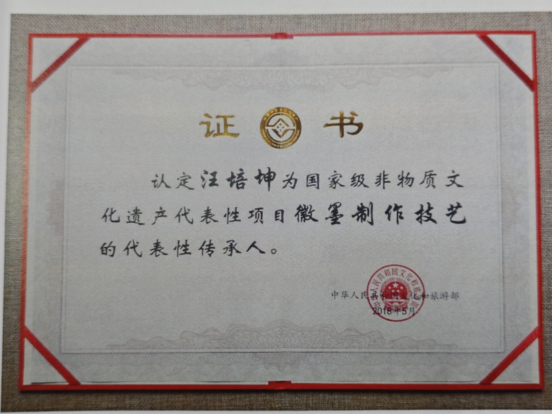 1998年起全国实行国有中小型企业体制改革,2001年当汪培坤获知屯溪胡开文墨厂改制要实行招投标的讯息后,为了延续“胡开文墨”这块老字号招牌,他果断参与竞标最终买下了墨厂。接手后,为了稳定生产,汪培坤给自愿留下的工人提高工资;为了扭亏为盈,他调整了企业经营策略,减少冗余行政人员;为了提高产品质量和品牌信誉,他严格把关原材料采购,钻研新配方和新产品,并请专业画家试墨等。他结合自己漆器制作的丰富经验,将漆器的描金技艺融入徽墨制作,首创了幻彩描金技艺,获得了市场的赞誉与欢迎。他还以生漆为原料,恢复并改良了自宋代就失传的漆烟墨,墨色乌黑发亮,在杭州、北京等地的展会上受到知名画家的高度认可。现已七十四岁的汪培坤除了设计一些新的墨模之外,还致力于修复墨厂保存的历史悠久的清代老墨模,并将厂里现有的墨模全部制成拓片,希望能将胡开文墨以及屯溪胡开文墨厂的历史记忆永久、妥善地传承下去。