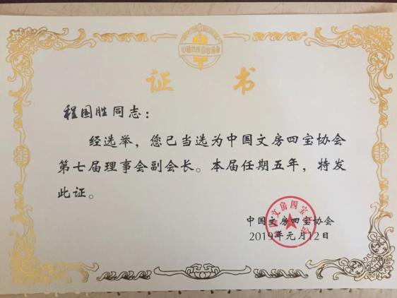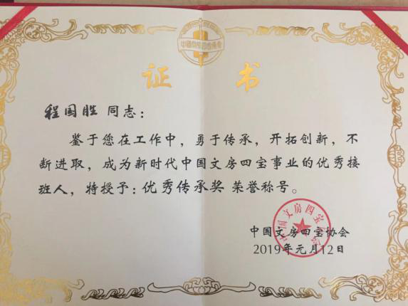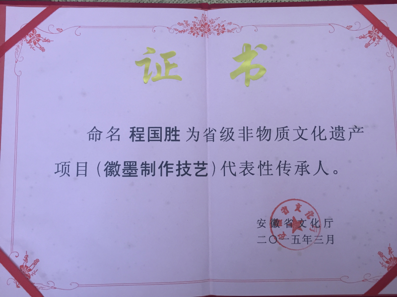 程国胜,1972年出生于屯溪湖边村,1993年起跟着师父汪培坤学习制砚,1996年开始学习徽墨制作技艺。汪培坤既是他的师父也是他的岳父,在传授技艺的过程中毫无保留,这使得程国胜在制墨技艺的学习上起点高、见识广,兼之改制前就在墨厂门市部内担任讲解、销售的工作,有与国内外客户打交道的经验,所以很快便成长为独当一面的制墨匠人和企业管理者。