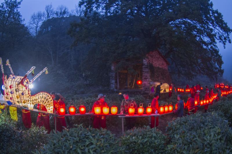 正月十五当天,龙从祠堂倒着出来,龙尾先出,龙头再出。沿着古道,先到村口五猖庙(建于水口处),再到孤坟总祭,最后到茶园的龙王庙与各家各户村民的龙身(每段“龙身”均由板凳、手柄和三个灯笼)集合接龙,龙身接好后,还要检查插销和绳索是否牢固。指挥下令“发灯”,大家就点上蜡烛放入灯笼,龙头龙尾设有专门的火门,放好蜡烛后要封火门,仅龙头龙尾就需三四十支蜡烛。随后,村民们烧纸祭拜,舞龙头的人也在此祭拜,每2人轮换,共同祈求来年风调雨顺、人丁兴旺、国富民强。祭祀完毕,随着锣鼓响起,烟花、爆竹齐鸣。引路人提着灯笼,指挥舞龙。队伍又沿着古道往上走,从五猖庙进村后,龙舞进入高潮,龙头上下翻动,配合口技、哨子,指挥提着灯笼引导舞龙,气氛热烈,游客欢呼不断。
